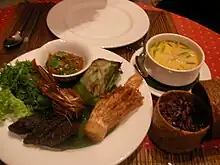 - Nem thadeua : spécialité lao, salade de riz croustillant, porc fermenté (som mou), légumes, cacahuètes… à manger enroulé dans une feuille de salade avec de la menthe, de la coriandre, etc.