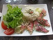 La salade niçoise est une spécialité culinaire célèbre du comté de Nice et de Provence, réalisée à base de crudités : cébettes, tomates, févettes, céleri, petits artichauts violets, poivrons verts et rouges, feuilles de basilic, œufs durs, filets d'anchois, huile d'olive et olives de Nice. Il y est souvent ajouté du thon, mais tout assaisonnement à la vinaigrette est exclu. Cette salade est l'une des principales entrées proposées en Provence, mais peut constituer à elle seule un repas à part entière[34].
