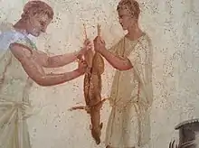 - les louches, cuillers et couteaux, l'harpago, la trulla, la furca et le carnarium, servent à couper les aliments ; la fourchette existe également, apparue au Ier siècle dans l'Empire romain, mais son usage reste mal connu[1] ;