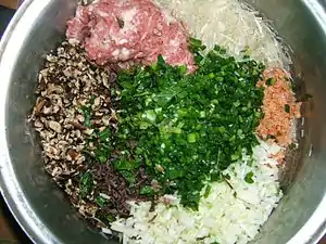 - Nems ou chả giò[16] (nom donné au sud) : galettes de riz frites fourrées avec une duxelles (c'est-à-dire une farce à base d'ingrédients hachés ou coupés menu), appelées également nem ran au nord ou « rouleau impérial » en France, à ne pas confondre avec les nem chua, boulettes de viande crue fermentée.
