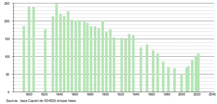 L'évolution du nombre d'habitants est connue à travers les recensements de la population effectués dans la commune depuis 1793. Pour les communes de moins de 10 000 habitants, une enquête de recensement portant sur toute la population est réalisée tous les cinq ans, les populations légales des années intermédiaires étant quant à elles estimées par interpolation ou extrapolation[13]. Pour la commune, le premier recensement exhaustif entrant dans le cadre du nouveau dispositif a été réalisé en 2008[14].