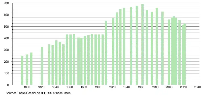 L'évolution du nombre d'habitants est connue à travers les recensements de la population effectués dans la commune depuis 1793. Pour les communes de moins de 10 000 habitants, une enquête de recensement portant sur toute la population est réalisée tous les cinq ans, les populations légales des années intermédiaires étant quant à elles estimées par interpolation ou extrapolation[17]. Pour la commune, le premier recensement exhaustif entrant dans le cadre du nouveau dispositif a été réalisé en 2004[18].