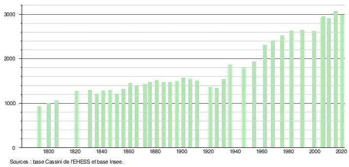 L'évolution du nombre d'habitants est connue à travers les recensements de la population effectués dans la commune depuis 1793. Pour les communes de moins de 10 000 habitants, une enquête de recensement portant sur toute la population est réalisée tous les cinq ans, les populations légales des années intermédiaires étant quant à elles estimées par interpolation ou extrapolation[20]. Pour la commune, le premier recensement exhaustif entrant dans le cadre du nouveau dispositif a été réalisé en 2005[21].