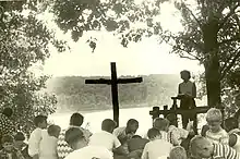 Le protestantisme ne sacralise pas ses lieux de culte. Aucun bâtiment ou local spécifiques n’est a priori nécessaire pour célébrer un culte puisque ce sont les croyants eux-mêmes qui sont « le temple de Dieu »[52]. Des cultes peuvent donc se tenir soit dans des bâtiments ad hoc, soit dans des maisons ou d’autres locaux, soit en plein air, soit encore lors de cultes radiodiffusés ou télévisés[1].