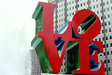 Sculpture LOVE de Robert Indiana. Version en couleurs au LOVE Park de Philadelphie, John F. Kennedy Plaza, 1970. 3,7 × 3,7 × 1,83 m. Une œuvre emblématique de la culture pop.