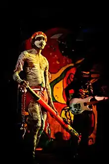 Le didjeridoo est originaire du nord de l'Australie, mais il est maintenant utilisé sur tout le continent. On utilise des clapsticks (en), des hochets à graines et des objets tels que des pierres ou des morceaux de bois ; dans quelques régions, les femmes jouent d'un tambour en peau de goanna[alpha 2], de serpent, de kangourou ou d'émeu[12].