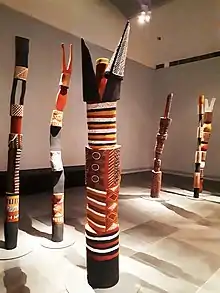Les Yolngu et les Bininj (en) (tous deux de la Terre d'Arnhem) fabriquent des poteaux funéraires (ou lorrkkon, ḻarrakitj, ḏupun). Destiné traditionnellement à contenir les ossements d'une personne et aux rites funéraires, ces troncs d'arbre creux décoré de motifs élaborés sont dorénavant de pures créations artistiques. L'exposition permanente Mémorial aborigène de la Galerie nationale d'Australie, se compose de 200 créations, créés par 43 artistes[39],[40].