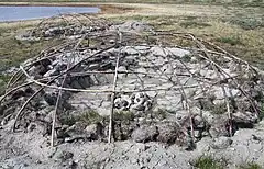 Dans la même région, le site de l'île Walrus (anciennement Hvalros O, ou Hvalrosø[199],[193]), localisé à 2 km de l'île Sabine en direction de l'est[Note 35], a révélé deux vestiges d'habitations saqqaquiennes en pierre. Ces habitats préhistoriques, établies sur la partie nord-ouest de l'île Walrus, présentent chacune un espace dégagée et un plan au sol de forme ovale. La présence d'éclats fabriqués en basalte à grain fin et issus de la réalisation de bifaces débités retrouvés à l'intérieur des vestiges, a permis d'attester que ces deux habitats ont été occupés par des saqqaquiens[201].