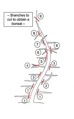 On peut distinguer 2 types de taille : d'une part, la taille d'entretien qui permet au bonsaï de garder sa forme générale (en coupant "ce qui dépasse") et, d'autre part, la taille de structure qui donne au bonsaï sa forme particulière.