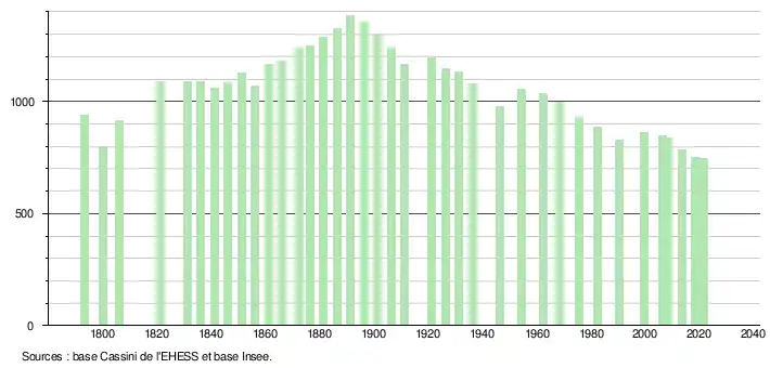 L'évolution du nombre d'habitants est connue à travers les recensements de la population effectués dans la commune depuis 1793. Pour les communes de moins de 10 000 habitants, une enquête de recensement portant sur toute la population est réalisée tous les cinq ans, les populations légales des années intermédiaires étant quant à elles estimées par interpolation ou extrapolation[21]. Pour la commune, le premier recensement exhaustif entrant dans le cadre du nouveau dispositif a été réalisé en 2008[22].