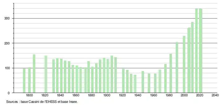 L'évolution du nombre d'habitants est connue à travers les recensements de la population effectués dans la commune depuis 1793. Pour les communes de moins de 10 000 habitants, une enquête de recensement portant sur toute la population est réalisée tous les cinq ans, les populations légales des années intermédiaires étant quant à elles estimées par interpolation ou extrapolation[15]. Pour la commune, le premier recensement exhaustif entrant dans le cadre du nouveau dispositif a été réalisé en 2005[16].