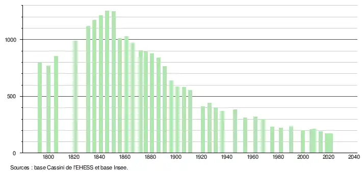 L'évolution du nombre d'habitants est connue à travers les recensements de la population effectués dans la commune depuis 1793. Pour les communes de moins de 10 000 habitants, une enquête de recensement portant sur toute la population est réalisée tous les cinq ans, les populations légales des années intermédiaires étant quant à elles estimées par interpolation ou extrapolation[16]. Pour la commune, le premier recensement exhaustif entrant dans le cadre du nouveau dispositif a été réalisé en 2008[17].