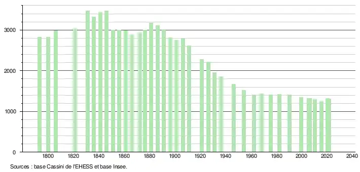L'évolution du nombre d'habitants est connue à travers les recensements de la population effectués dans la commune depuis 1793. Pour les communes de moins de 10 000 habitants, une enquête de recensement portant sur toute la population est réalisée tous les cinq ans, les populations légales des années intermédiaires étant quant à elles estimées par interpolation ou extrapolation[17]. Pour la commune, le premier recensement exhaustif entrant dans le cadre du nouveau dispositif a été réalisé en 2005[18].