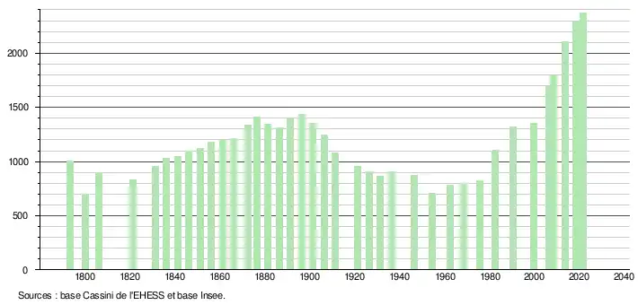 L'évolution du nombre d'habitants est connue à travers les recensements de la population effectués dans la commune depuis 1793. Pour les communes de moins de 10 000 habitants, une enquête de recensement portant sur toute la population est réalisée tous les cinq ans, les populations légales des années intermédiaires étant quant à elles estimées par interpolation ou extrapolation[33]. Pour la commune, le premier recensement exhaustif entrant dans le cadre du nouveau dispositif a été réalisé en 2008[34].