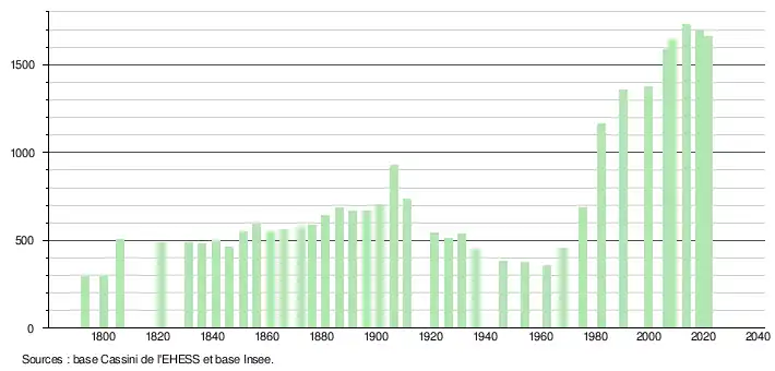 L'évolution du nombre d'habitants est connue à travers les recensements de la population effectués dans la commune depuis 1793. Pour les communes de moins de 10 000 habitants, une enquête de recensement portant sur toute la population est réalisée tous les cinq ans, les populations légales des années intermédiaires étant quant à elles estimées par interpolation ou extrapolation[21]. Pour la commune, le premier recensement exhaustif entrant dans le cadre du nouveau dispositif a été réalisé en 2008[22].