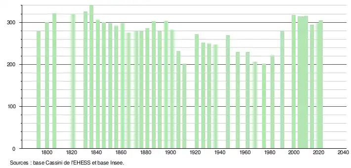 L'évolution du nombre d'habitants est connue à travers les recensements de la population effectués dans la commune depuis 1793. Pour les communes de moins de 10 000 habitants, une enquête de recensement portant sur toute la population est réalisée tous les cinq ans, les populations légales des années intermédiaires étant quant à elles estimées par interpolation ou extrapolation[27]. Pour la commune, le premier recensement exhaustif entrant dans le cadre du nouveau dispositif a été réalisé en 2004[28].