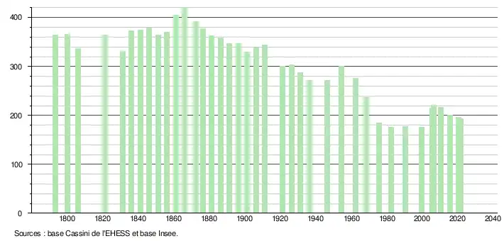 L'évolution du nombre d'habitants est connue à travers les recensements de la population effectués dans la commune depuis 1793. Pour les communes de moins de 10 000 habitants, une enquête de recensement portant sur toute la population est réalisée tous les cinq ans, les populations légales des années intermédiaires étant quant à elles estimées par interpolation ou extrapolation[29]. Pour la commune, le premier recensement exhaustif entrant dans le cadre du nouveau dispositif a été réalisé en 2005[30].