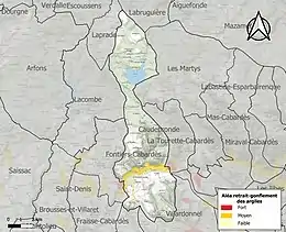 Le retrait-gonflement des sols argileux est susceptible d'engendrer des dommages importants aux bâtiments en cas d’alternance de périodes de sécheresse et de pluie. 4,1 % de la superficie communale est en aléa moyen ou fort (75,2 % au niveau départemental et 48,5 % au niveau national). Sur les 498 bâtiments dénombrés sur la commune en 2019, 186 sont en aléa moyen ou fort, soit 37 %, à comparer aux 94 % au niveau départemental et 54 % au niveau national. Une cartographie de l'exposition du territoire national au retrait gonflement des sols argileux est disponible sur le site du BRGM[26],[Carte 3].