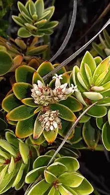 Les fleurs sont petites, sessiles, blanches, et sont concentrées à l'extrémité des tiges[1]. Elles sont blanches à rosées et ont 5 pétales[2].