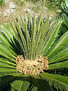 Les Cycadacées ont leur tronc élancé, généralement non ramifié, ou trapu, presque sphérique. Souvent, il est couvert de couches de feuilles écailleuses disposées en spirale et à son sommet se trouve une couronne de grandes feuilles composées-pennées. Les jeunes folioles sont enroulées en crosse comme les frondes de fougères et se déploie pour forme la couronne. Les folioles des cycadacées ont une nervation une seule nervure centrale.