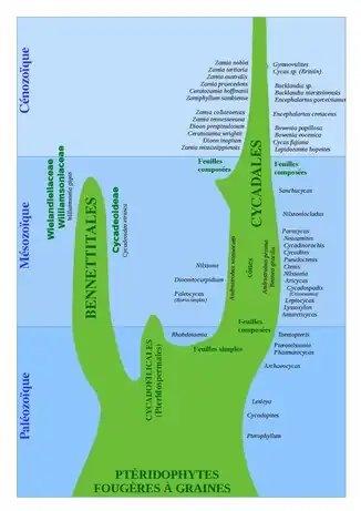 L'ordre des Cycadales, qui fait partie des préspermaphytes, sont divisés en deux branches les Zamiacées (9 genres) et les Cycadacées (1 genre) :