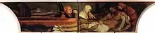 | La Déploration sur le corps du Christ mort | Matthieu 27, 57-61[1] ; Marc 15, 42-47[1] ; Luc 23, 50-55[1] ; Jean 19, 38-42[1] | La scène rarement représentée se passe au pied de la croix et le Christ est prêt à être enveloppé dans le linceul apporté par Joseph d'Arimathie et Nicodème. La Vierge qui peut tenir le corps du défunt dans ses bras, saint Jean-Baptiste et souvent Marie-Madeleine accompagnent le corps du Christ. | Matthias Grünewald, Déploration du Christ, prédelle du retable d'Issenheim, 1512-1516, tempera et huile sur bois de tilleul, Colmar, musée Unterlinden |