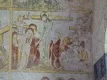 | La Mise au tombeau | Matthieu 27, 57-61[1] ; Marc 15, 42-47[1] ; Luc 23, 50-55[1] ; Jean 19, 38-42[1] | Dans cette scène rarement représentée, nous apercevons au centre le Christ enveloppé dans le linceul apporté par Joseph d'Arimathie et Nicodème, tenu par la Vierge au côté de saint Jean-Baptiste. Ils sont souvent accompagnés de Marie-Madeleine et des saintes femmes. Nous y voyons surtout le tombeau dans lequel le Christ va ou est déjà installé. | ![]() Mise au tombeau du Christ, fin XVe siècle, église Saint-Pierre de Saint-Pé-d'Ardet |