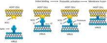 Pour infecter une cellule, deux clivages protéolytiques successifs sont nécessaires. Le premier clivage génère S1 et S2. Le second appelé S2' libère l'extrémité du peptide de fusion (FP). Une des originalités de la protéine S du SARS-CoV-2 est qu’elle intègre une séquence d'activation au site de clivage dit « S1 / S2 », similaire aux séquences observées dans les virus de grippe. Ainsi, à l’instar du virus de la grippe, la protéine S du SARS-CoV-2 peut être clivée à l’aide d’une protéase qui se trouve en abondance dans le plasma : la furine. Le SARS-CoV-1 en était incapable. Les scientifiques suggèrent que cette capacité à pouvoir cliver S1 et S2 par la furine est la raison pour laquelle le SARS-CoV-2 est devenu une épidémie[36]. En revanche d'après le virologue du CNRS Étienne Decroly, la protéase TMPRSS2 connue pour être capable de cliver la protéine S du SARS-CoV-1, est présentée à tort par la littérature comme capable de cliver S1/S2 ou S2' du SARS-CoV-2[33]. TMPRSS2 facilite bien l'infection de cellules par le SARS-CoV-2 mais surtout dans le cadre de la formation de syncytia[37]. Enfin le clivage de S2' peut se faire aussi bien par la furine que par Cathepsin B (en) et probablement par d'autres protéases[33].