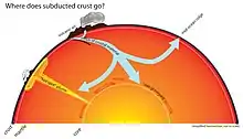 Le carbone entre principalement dans le manteau sous la forme de sédiments riches en carbonates sur les plaques tectoniques de la croûte océanique, qui attirent le carbone dans le manteau lors de la subduction. On ne sait pas grand-chose sur la circulation du carbone dans le manteau, en particulier dans les profondeurs de la Terre, mais de nombreuses études ont tenté d'améliorer notre compréhension de son mouvement et de ses formes dans le manteau inférieur. Par exemple, une étude de 2011 a démontré que le cycle du carbone s'étend jusqu'au manteau inférieur. L'étude a analysé des diamants rares profondément enfouis sur un site de Juina, au Brésil, déterminant que la composition en vrac de certaines des inclusions de diamants correspondait au résultat attendu à la suite de la fusion et de la cristallisation du basalte sous des températures et des pressions du manteau plus basses. Ainsi, les résultats de l'enquête indiquent que des morceaux de lithosphère océanique basaltiques agissent comme le principal mécanisme de transport du carbone le manteau inférieur de la Terre. Ces carbonates subduits peuvent interagir avec les silicates et les métaux du manteau inférieur, formant éventuellement des diamants super-profonds comme celui trouvé[11].
