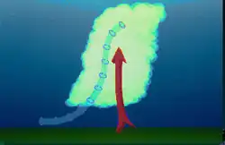 Une dépression dans le sillage est un autre type de zone dépressionnaire de méso-échelle à l'arrière d'une ligne de grain près du bord arrière de la zone de pluie stratiforme[19]. En raison de l'air chaud subsidant associé avec leur formation, l'air s'y assèche et le ciel se dégage. Des vents violents peuvent être notés à cause de la différence pression entre la dépression et l'anticyclone de méso-échelle qui existe sous le courant descendant de l'orage[20]. Lorsque la ligne de grains est en affaissement, un coup de chaleur peut être généré près de la dépression dans le sillage.