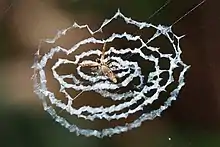 Ces araignées tissent des disques blancs de soie au centre de leur toile. Elles affichent leurs abdomens argentés et leurs pattes couvertes de taches noires donnant l'apparence de la fiente d'oiseaux. Ce serait un avantage évolutif qui lui permettrait de limiter les attaques de guêpes prédatrices, la probabilité des attaques étant plus grande lorsque ces attributs sont expérimentalement noircis[4],[5].