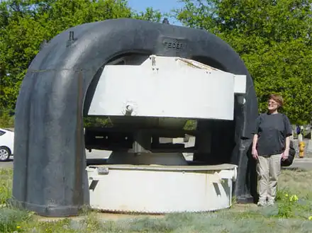 Ernest Orlando Lawrence, professeur à l'université de Californie à Berkeley, lit l'article de Widerøe sur l'accélérateur linéaire et imagine que le même principe peut être appliqué à un accélérateur circulaire. Il confie la réalisation à un étudiant, M. Stanley Livingston, qui construit le premier cyclotron mis en service en 1932[18],[19]. Au laboratoire des radiations à Berkeley, Lawrence construit ensuite une série de cyclotrons de plus en plus puissants : un 69 cm à 4,8 MeV en 1932, un 94 cm, 8 MeV en 1937, un 152 cm, 19 MeV en 1939 et un 465 cm synchrocyclotron en 1945. Il reçoit le prix Nobel de physique en 1939.