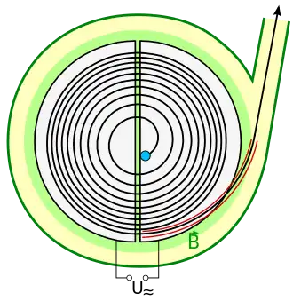 - une modulation azimutale : une alternance de secteurs de champ fort et de champ faible maintient la stabilité transversale des particules sur leur trajectoire spirale[6]. C'est pourquoi ces cyclotrons isochrones sont aussi appelés cyclotrons AVF (azimuthal varying field).
