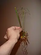 Cyperus alternifolius peut se reproduire par bouturage: plonger une tige, bractées raccourcies, tête en bas dans l'eau va produire des racines puis de nouvelles tiges vers le haut.