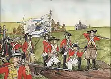 Une journée fut ainsi perdue. S'étant assurés que la côte était bel et bien dégagée, les émigrés, régiment d'Hervilly et Loyal-Emigrant en tête, mirent pied à terre sur la plage de Carnac, le 27 juin. Cependant, le même jour, les Chouans durent s'opposer à la première réaction républicaine : un détachement de 200 hommes commandés par l'adjudant-général Balthazar Romand tenta de les attaquer, mais ses forces étaient trop faibles. Vincent de Tinténiac avec 700 hommes s'empara du tumulus Saint-Michel dit « Mont-Saint-Michel » et y planta sa chemise blanche fixée à un mât en guise de drapeau[18]. Romand fut ensuite chassé de la côte et se replia sur Auray.
