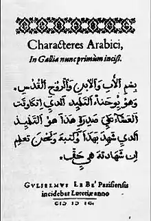 À Paris, le graveur de caractères Guillaume II Le Bé disposa d'une série arabe à partir de 1599, la première fabriquée en France. En 1613, François Savary de Brèves, ambassadeur de France auprès du Saint-Siège, fonda à Rome une imprimerie orientale, la Typographia Savariana, pour laquelle il fit fabriquer des poinçons de caractères arabes, et l'année suivante, rappelé à Paris par la reine Marie de Médicis, il emporta avec lui ce matériel, et se fit accompagner également de chrétiens libanais, Gabriel Sionite, Victor Scialac et Jean Hesronite. il remonta son atelier d'imprimerie dans le collège des Lombards. En sortit en 1616 le premier volume d'une Grammaire arabe, consacré à la lecture et à l'écriture, mais il n'y en eut pas de second. Ensuite, de 1628 à 1645, il y eut l'aventure de la Bible polyglotte de Paris, en sept langues dont l'arabe. Antoine Vitré, nommé en 1630 imprimeur du roi pour les langues orientales, et responsable de cette Bible, racheta le matériel de Savary de Brèves.