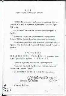 L'Acte de déclaration d'indépendance de l'Ukraine (en ukrainien Акт проголошення незалежності України, Akt proholochennia nezalejnosti Oukraïny) est l'acte d'indépendance adopté par le Soviet suprême de la RSS d'Ukraine (en) le et rétablissant l'indépendance de l'État ukrainien[1],[2].