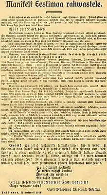 Durant la Première Guerre mondiale, entre le retrait de la Russie et l'avancée des troupes allemandes, et à l'approche de l'occupation de l'Estonie par l'Empire allemand, le Comité de salut public (en), élu par les anciens de l'Assemblée provinciale d'Estonie (en), rédigea la déclaration. Originellement prévue pour être proclamée le , la proclamation fut repoussée au soir du , quand le manifeste fut imprimé et lu publiquement à Pärnu. Le jour suivant, le , le manifeste fut imprimé et distribué dans la capitale, Tallinn[1],[2].