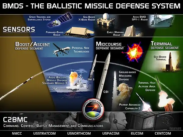 La largeur du périmètre couvert par la défense antimissile a conduit à le segmenter en d'une part la défense antimissile de territoire (en anglais National Missile Défense - NMD) et d'autre part la défense antimissile de théâtre (en anglais Theater Missile Défense - TMD).