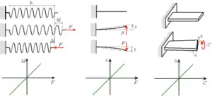 L'élasticité linéaire concerne les petites déformations proportionnelles à la sollicitation. Dans cette gamme, l'allongement est proportionnel à la force dans le cas d'un étirement, selon le module de Young, et l'angle est proportionnel au couple dans le cas d'une torsion, selon le module de Coulomb.