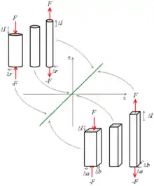 Si l'on considère un parallélépipède rectangle, le cisaillement est une variation de l'angle, qui n'est plus droit. Cela correspond à des forces s'exerçant parallèlement à la face.