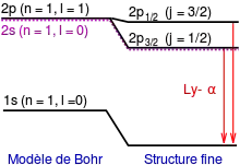 Les corrections à l'interaction coulombienne entre l'électron et le proton d'un atome d'hydrogène dues au mouvement relativiste et au couplage spin-orbite entraînent la brisure de la dégénérescence des niveaux d'énergie des valeurs différentes du nombre quantique pour la même valeur du nombre quantique . En conséquence une raie spectrale est séparée en plusieurs raies voisines dites sa structure fine.
