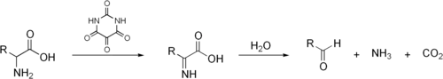 La réaction originale observée par Strecker implique l'utilisation d'un alloxane comme oxydant[1]: