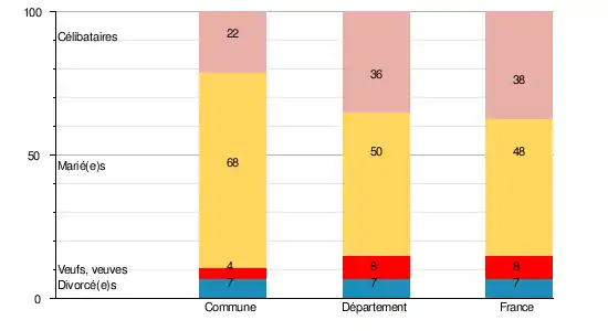 En 2009, la commune comptait 21,8 % de célibataires, 67,7 % de personnes mariées, 3,9 % de veufs ou veuves et 6,6 % de divorcé(e)s[13]. Le taux de personnes mariées apparaît ainsi très supérieur à celui du département (49,8 %)[14] mais aussi de la France (47,5 %)[15].