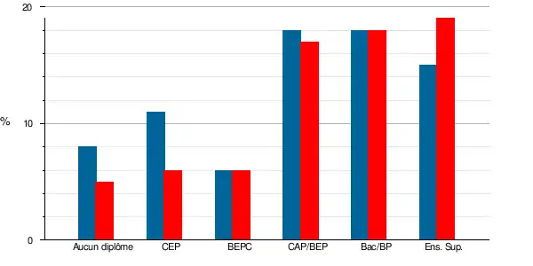 | Titulaires d'un diplôme de l'enseignement supérieur long | 239 | 29,3 % | 146 | 23,2 % | 10,5 | 7,6 | 12,7 | 8,8 |