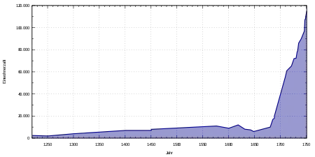 Au début de son histoire en 1220, Berlin était une petite île sur la Sprée de 1 200 habitants. L'immigration des huguenots français à la suite de l'Édit de Potsdam en 1685 a donné une forte impulsion à la ville, alors peuplée de 10 000 habitants. Sa superficie et sa population ont progressé jusqu'en 1747 où elle a dépassé la barre des 100 000 habitants. Le siècle suivant était celui de l'industrialisation et du boom démographique de la ville qui a dépassé le million d'habitants en 1877. L'intégration des communes limitrophes pour créer le grand Berlin en 1920 a fait de la ville pendant les années 1920 et 1930 la plus grande ville du continent européen et la troisième ville du monde après New York et Londres. Elle a connu sa plus grande population pendant la période du national-socialisme en 1942 avec 4 478 102 habitants, avant de baisser drastiquement à la fin de la Seconde Guerre mondiale à 2 807 405. La population a ensuite très légèrement augmenté de quelques dizaines de milliers d'habitants pendant la partition, avant d'accuser une légère baisse après la réunification à la fin des années 1990. La population actuelle augmente aujourd'hui très lentement. La croissance démographique était en 2010 de 5,2 ‰ surtout grâce à un solde migratoire de 4,9 ‰. Le nombre d'enfants par femme en 2012 est de 1,34. Le recensement de 2011 a néanmoins revu à la baisse les estimations précédentes des vingt dernières années[5]. Cet écart statistique entre le recensement et les estimations a créé une forte polémique médiatique nationale[6] et a eu des conséquences graves sur le budget de la ville de Berlin qui a depuis porté plainte.