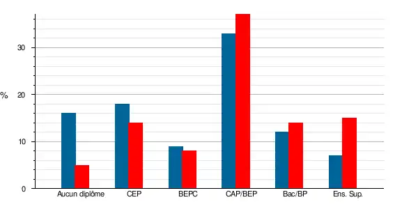 Le taux de personnes non scolarisées sans diplôme a diminué entre 1999 (15,7 %) et 2009 (4,9 %)[13]. Il est inférieur à celui de l'Ain (17,1 %) et à celui de la France métropolitaine (18,3 %)[14]. Parallèlement le taux de personnes titulaires d'un diplôme de l'enseignement supérieur long est passé de 4,6 % en 1999 à 7 % en 2009, un taux inférieur à celui de l'Ain (10,6 %)[15] et au taux national relatif à la France métropolitaine (12,7 %)[14].