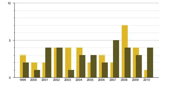 | 1968 à 1975 | 1975 à 1982 | 1982 à 1990 | 1990 à 1999 | 1999 à 2009 | ||