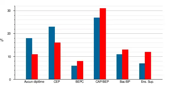 | Titulaires du certificat d'études primaires | 37 | 15,9 % | 46 | 22,5 % | 12,4 | 19 | 11,1 | 17,6 |
