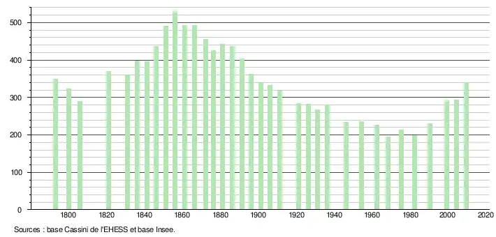 L'évolution du nombre d'habitants est connue à travers les recensements de la population effectués périodiquement dans la commune depuis 1793. Après avoir présenté un maximum en 1856 avec 530 habitants, la population de la commune diminue jusqu'en 1968 avec un minimum à 194 habitants puis croît modérément.